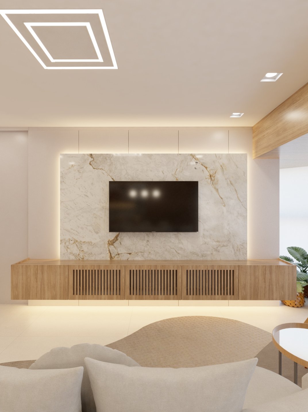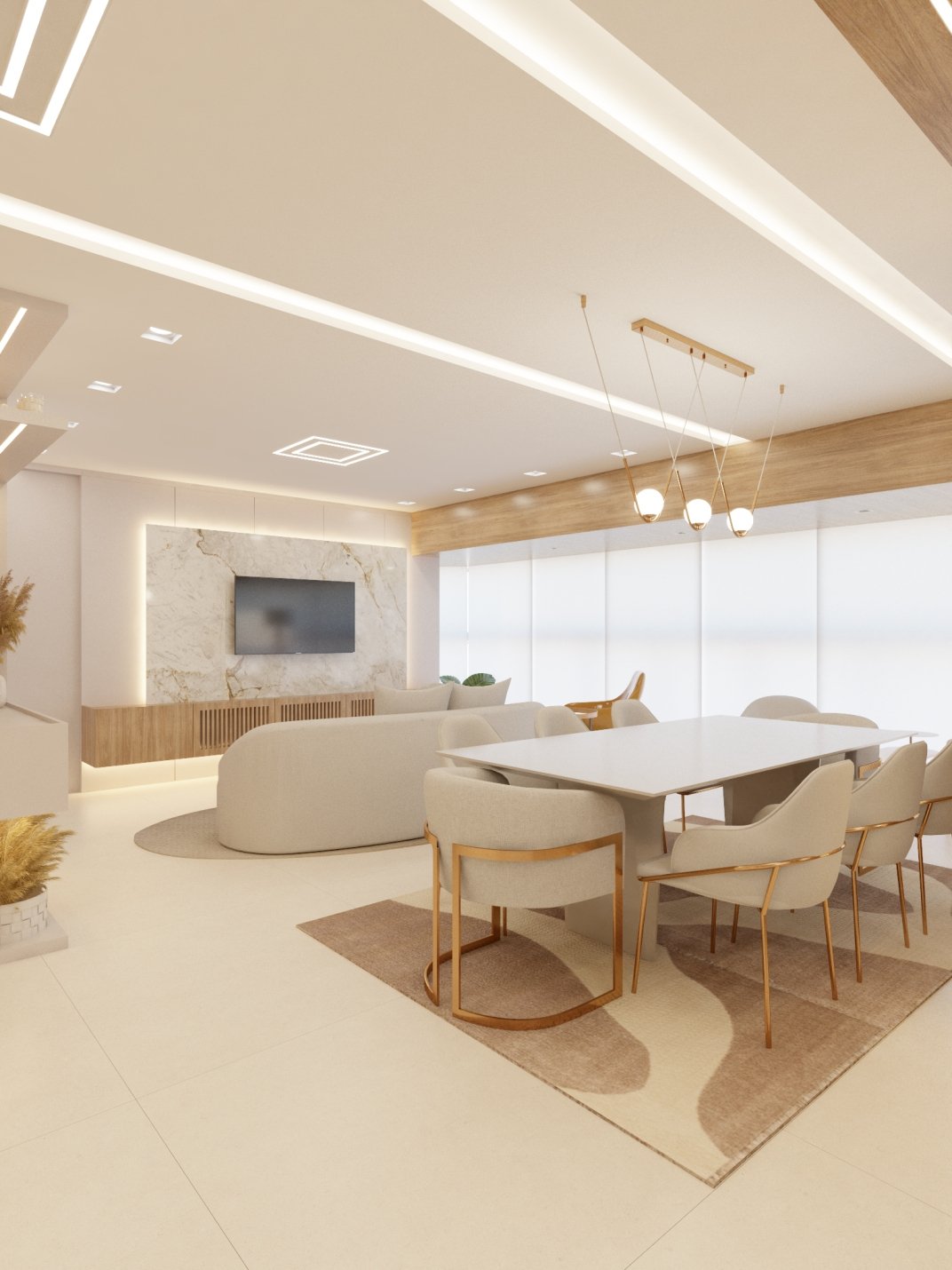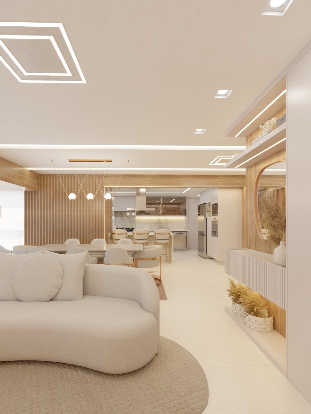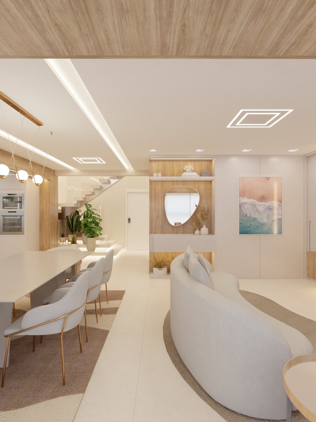 Localizado à Beira-Mar no coração da Barra da Tijuca, este apartamento de 300m² foi projetado para maximizar e valorizar sua deslumbrante vista para o mar. O Projeto envolveu a remoção das paredes que separavam a sala da varanda e a cozinha, criando um conceito aberto que integra esses espaços em um ambiente expansivo e convidativo, ideal para recepções e encontros sociais. A paleta clássica, com tons claros de cinza, off white e madeira, complementa a luminosidade natural e realça a sensação de amplitude. O destaque do projeto é a utilização de pedra natural Mármore Branco Paraná, aplicada nas bancadas e no painel de TV, que adiciona um toque de elegância atemporal. A iluminação foi meticulosamente planejada para ressaltar a beleza dos materiais e das soluções adotadas, enquanto o mobiliário, com seu design orgânico e curvas suaves, promove uma circulação fluida e um ambiente sutilmente harmônico. O resultado é um espaço sofisticado e acolhedor, que celebra tanto a vista quanto o conforto.