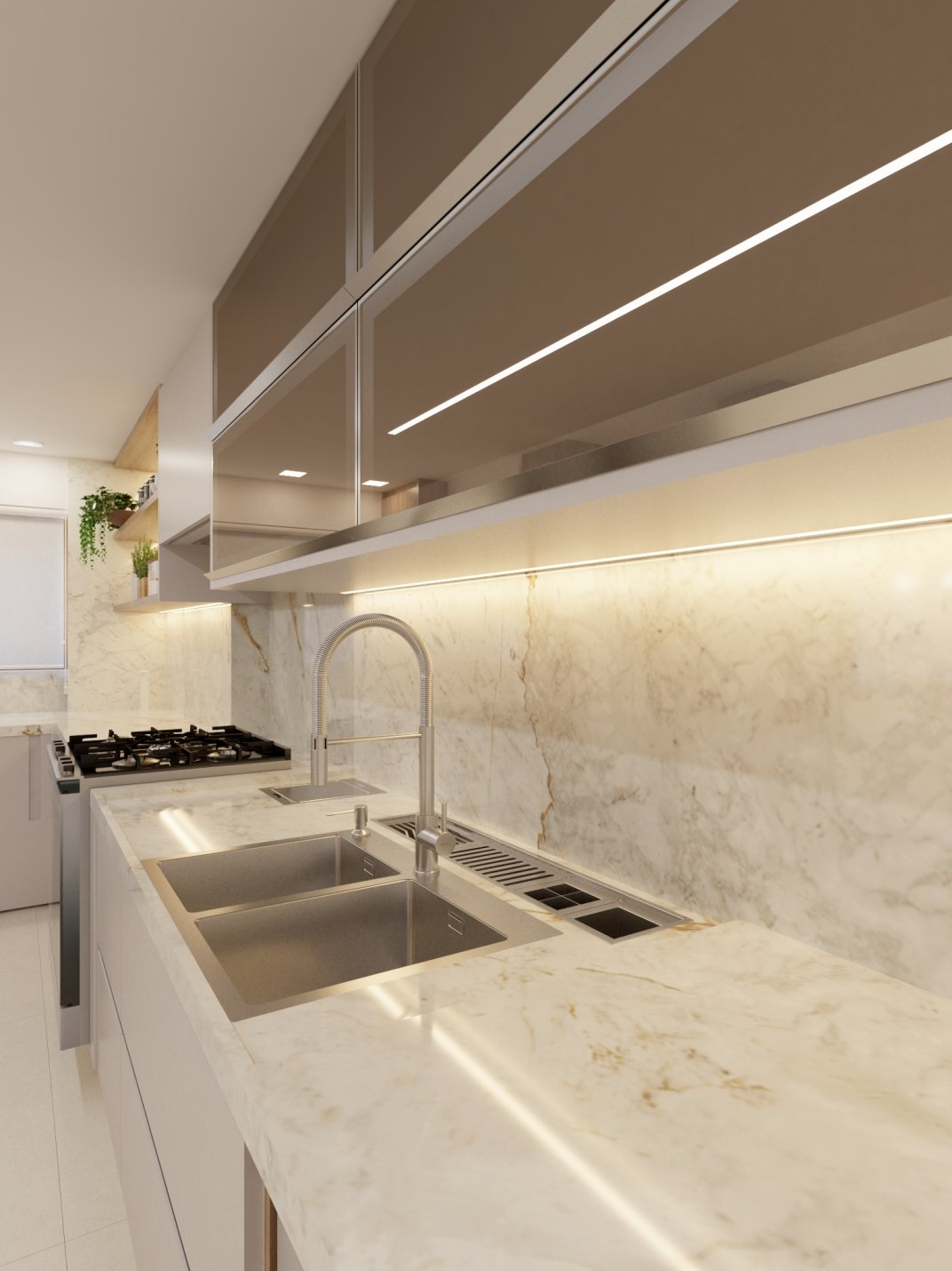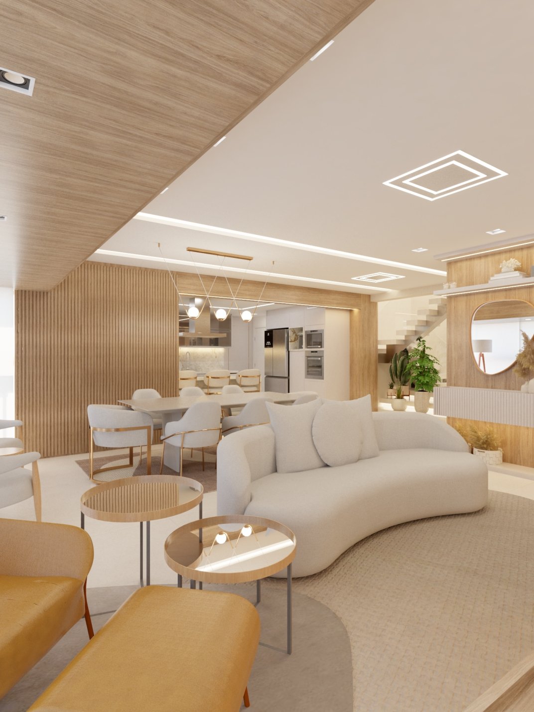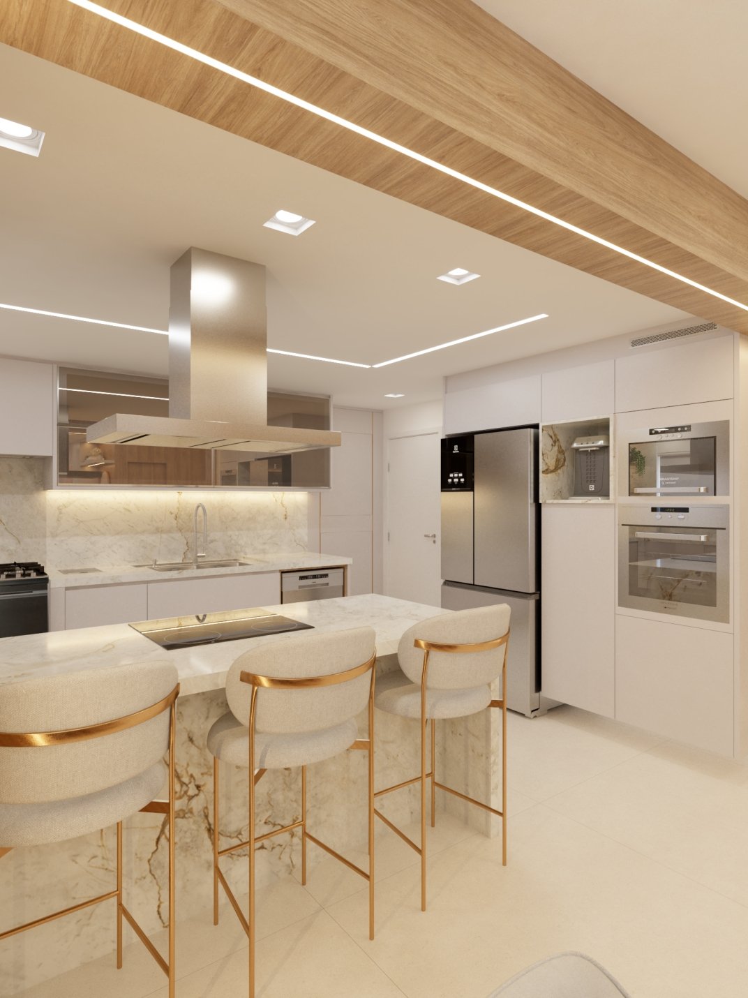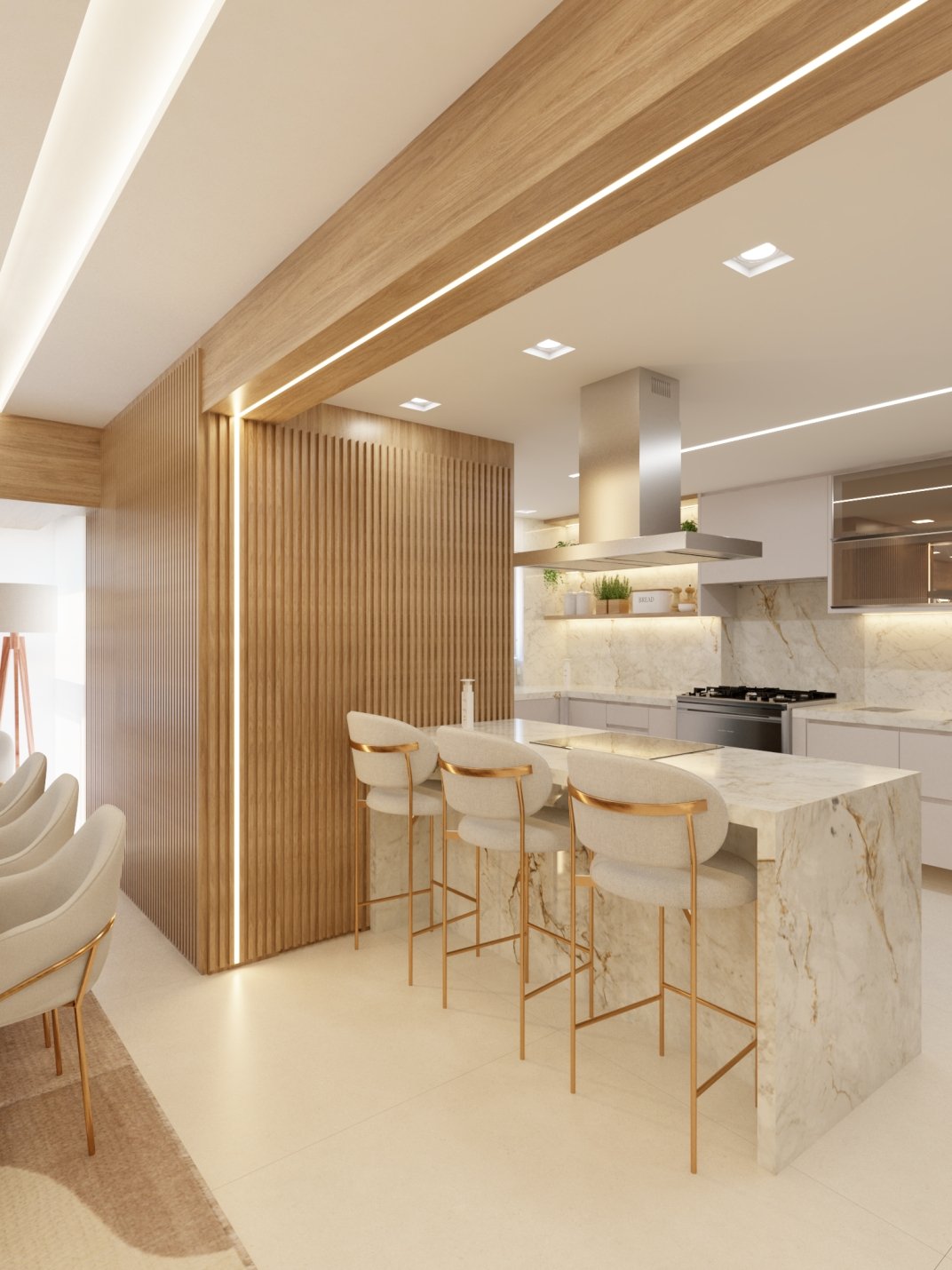 Localizado à Beira-Mar no coração da Barra da Tijuca, este apartamento de 300m² foi projetado para maximizar e valorizar sua deslumbrante vista para o mar. O Projeto envolveu a remoção das paredes que separavam a sala da varanda e a cozinha, criando um conceito aberto que integra esses espaços em um ambiente expansivo e convidativo, ideal para recepções e encontros sociais. A paleta clássica, com tons claros de cinza, off white e madeira, complementa a luminosidade natural e realça a sensação de amplitude. O destaque do projeto é a utilização de pedra natural Mármore Branco Paraná, aplicada nas bancadas e no painel de TV, que adiciona um toque de elegância atemporal. A iluminação foi meticulosamente planejada para ressaltar a beleza dos materiais e das soluções adotadas, enquanto o mobiliário, com seu design orgânico e curvas suaves, promove uma circulação fluida e um ambiente sutilmente harmônico. O resultado é um espaço sofisticado e acolhedor, que celebra tanto a vista quanto o conforto.
